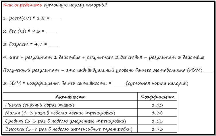 Однако для любителей математических расчетов мы приводим формулу, по которой можно более точно определить количество расходуемой энергии за день и таким образом знать, сколько нужно есть, чтобы похудеть. Еще раз повторяем, что желательно перейти на потребление 1000-1400 ккал в день без всяких сложных расчетов.