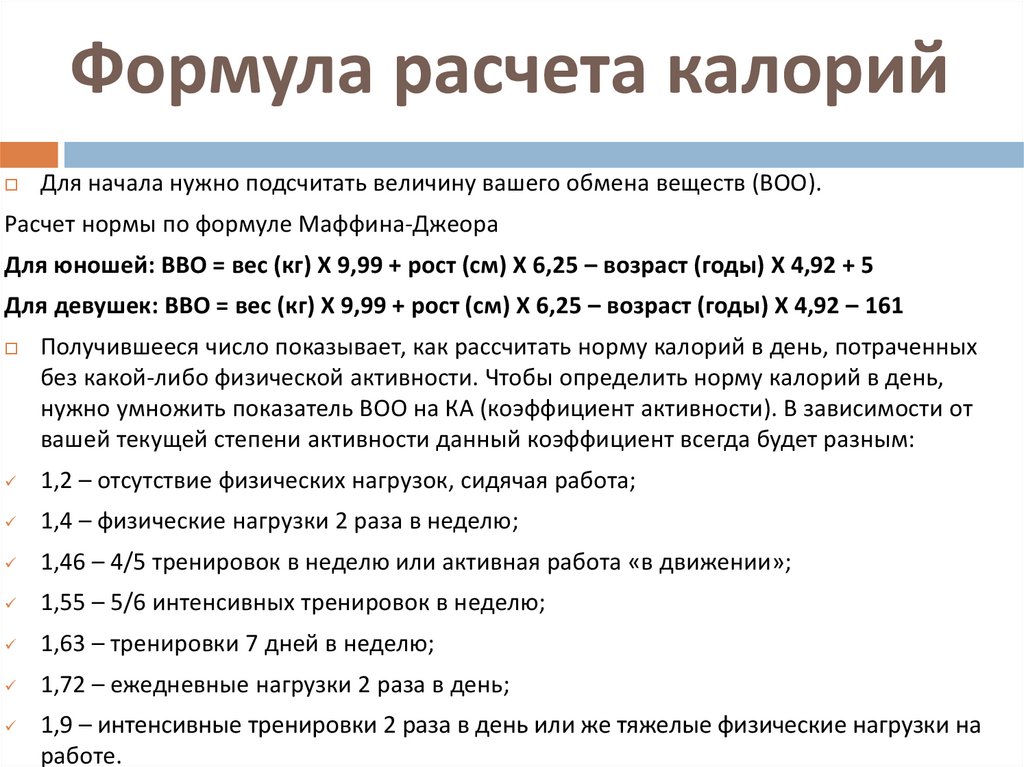 Для женщин Mifflin- Санкт-ПетербургУравнение уравнения Джеора: BMR = (10 x вес в кг) + (6,25 x рост в см) — (5 x возраст в годах) — 161.