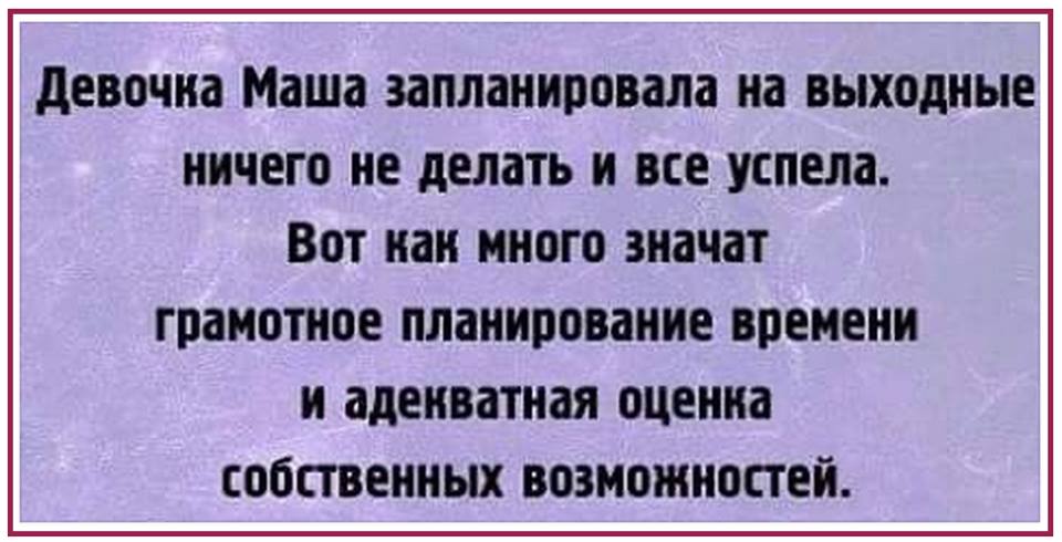 Всегда можно зайти слишком далеко в этой защите праздности и рискнуть уподобиться лентяю, который на вопрос «Чем ты занимаешься?» отвечает: «Как можно меньше». Хитрость заключается в том, чтобы не стать ни трудоголиком, ни бездельником. Это вопрос поиска баланса между работой и отдыхом, при котором ни одно из них не игнорируется и не вытесняет другое. И то, и другое должно быть в вашем списке дел, предпринятых целенаправленно и серьезно в определенных местах и в определенное время.