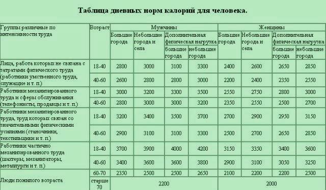 Для мужчин старше 51 года аналогичные показатели составят 1800, 2250-2300 и 2400-2800 ккал в сутки.