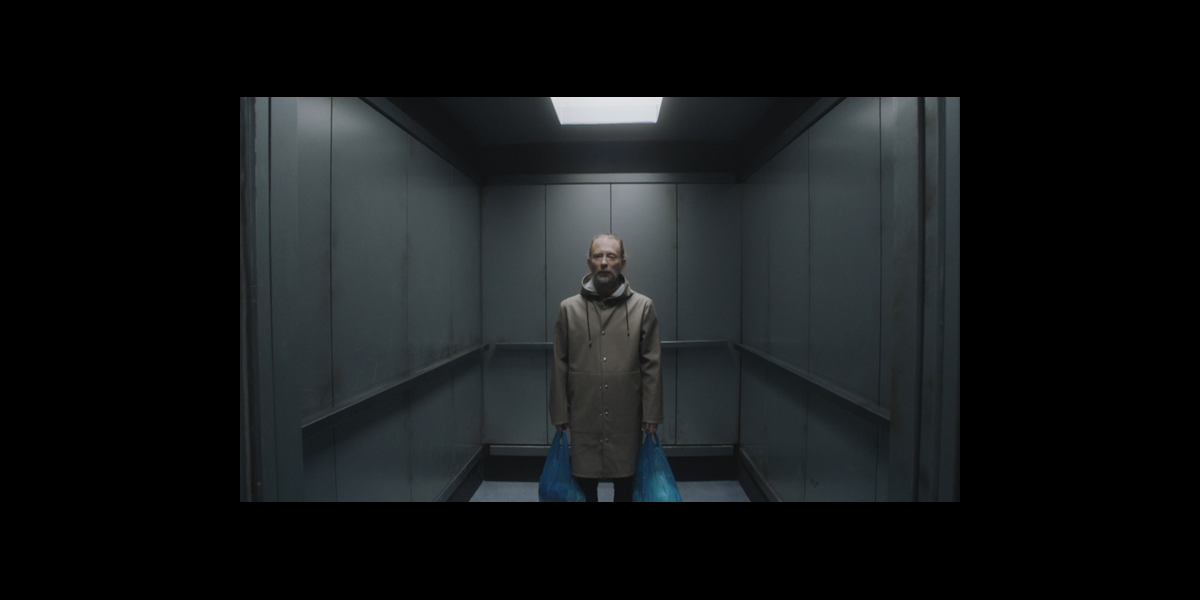 В клипе Том Йорк с пакетами в руках едет на лифте в довольно странном доме.
