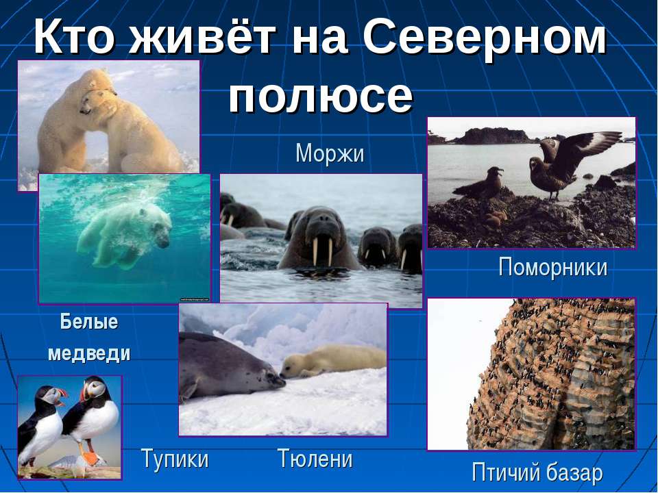 Ниже представлены основные животные и птицы, какие живут на Северном полюсе.