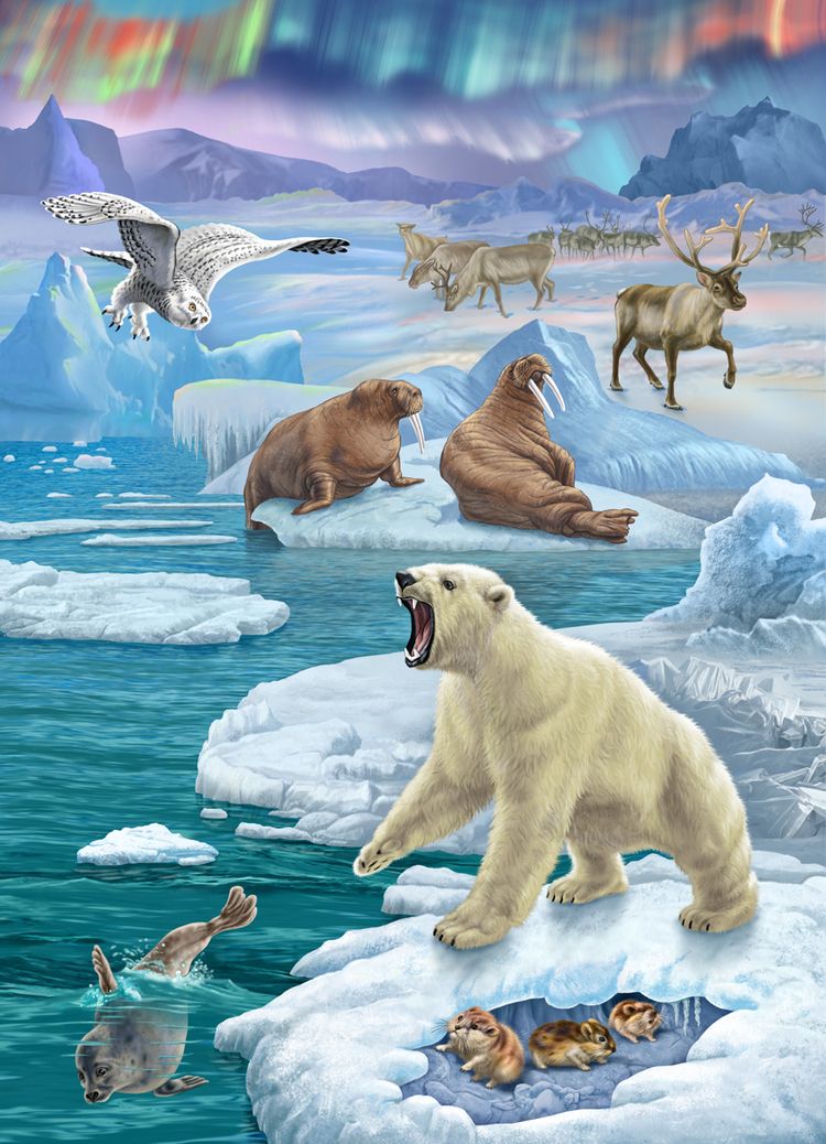 - В нем представлены дикие животные , такие как северные олени, лисы , белые медведи и моржи.