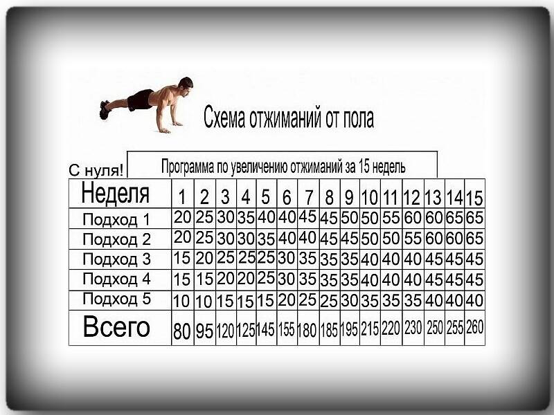 - Программа отжиманий для мужчин с начальным уровнем подготовки (таблица на 3 месяца)