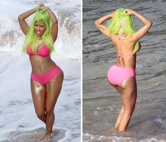 Тонкая талия резко переходит в бедра, а попа Ники Минаж напоминает подушку безопасности.