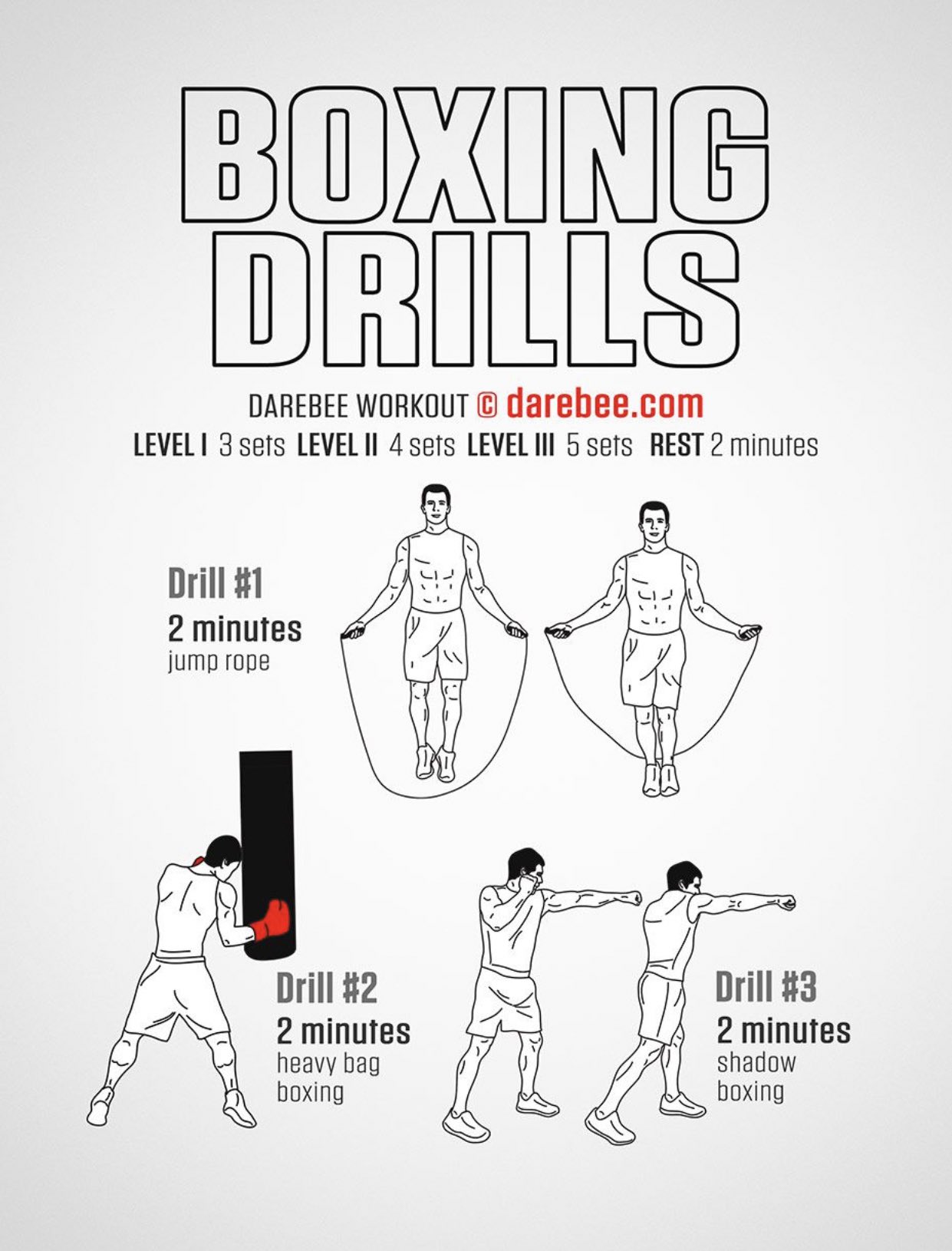 Я также хотел убедиться, что эти тренировки может выполнять любой, кто занимается боксом от начального уровня и выше. Потребности в оборудовании минимальны. Вам нужен только доступ к ручным бинтам, перчаткам для сумки, небольшому пространству для теневого бокса и тяжелой сумке.Если у вас есть больше, например, двухсторонний мешок, скоростной мешок, боксерский ринг и спарринг-партнеров, я учел это как часть ваших тренировочных вариантов, однако они не являются необходимыми для выполнения этих тренировочных планов.