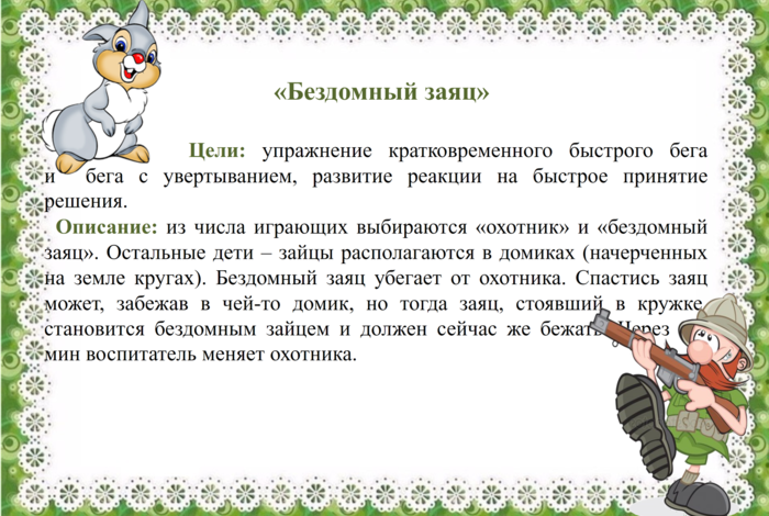 На полу раскладываются обручи по количеству детей. Дети – «зайчики» — прыгают и бегают по комнате. На слова взрослого: «Серый волк!» — дети забегают в свои «домики».