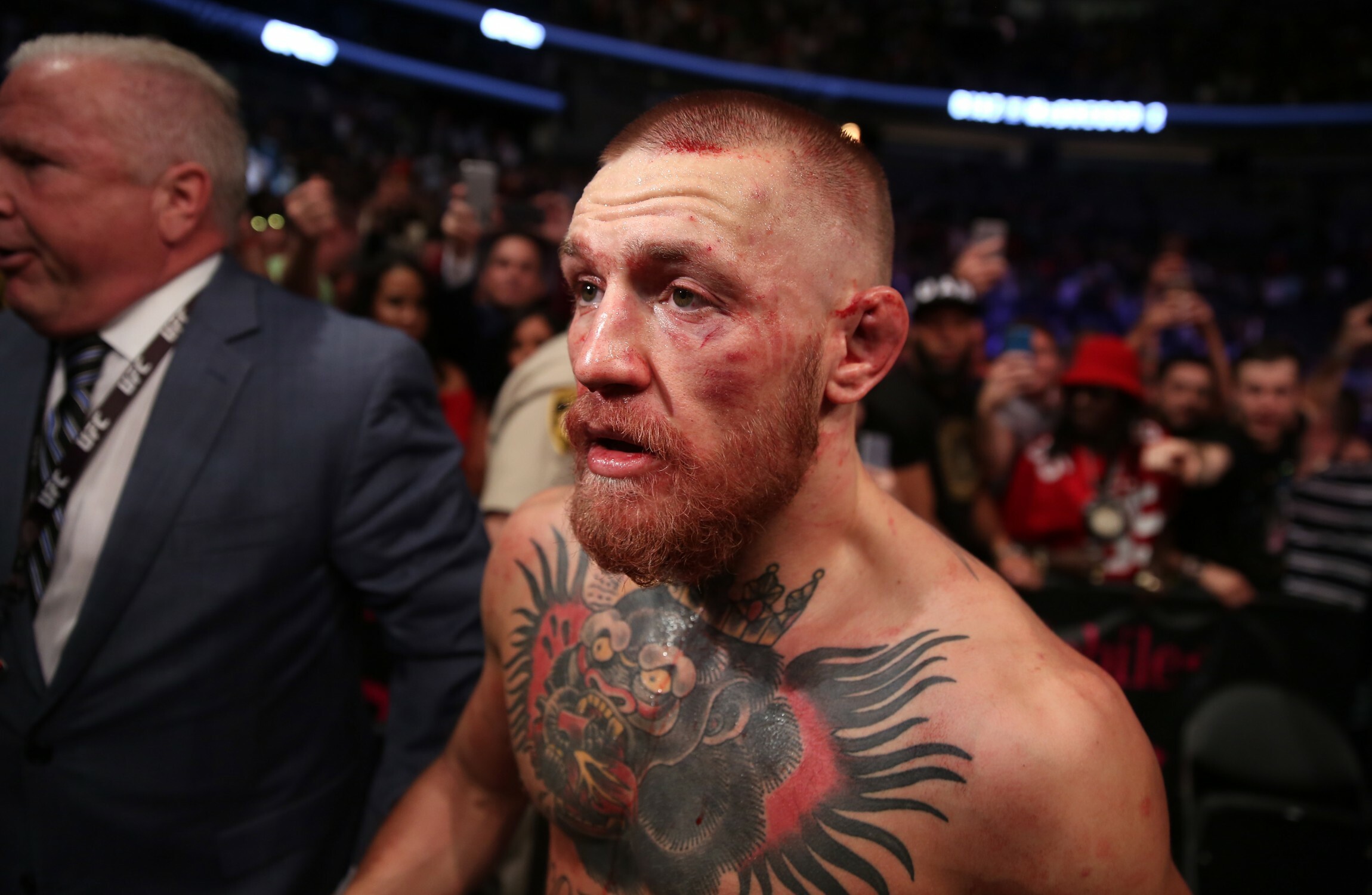 Конор МакГрегор реагирует после проигрыша боя в UFC.