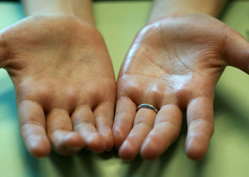 При воздействии тепла люди, не страдающие гипергидрозом, как правило, не сильно потеют в ладонях, в отличие от пациентов с гипергидрозом.