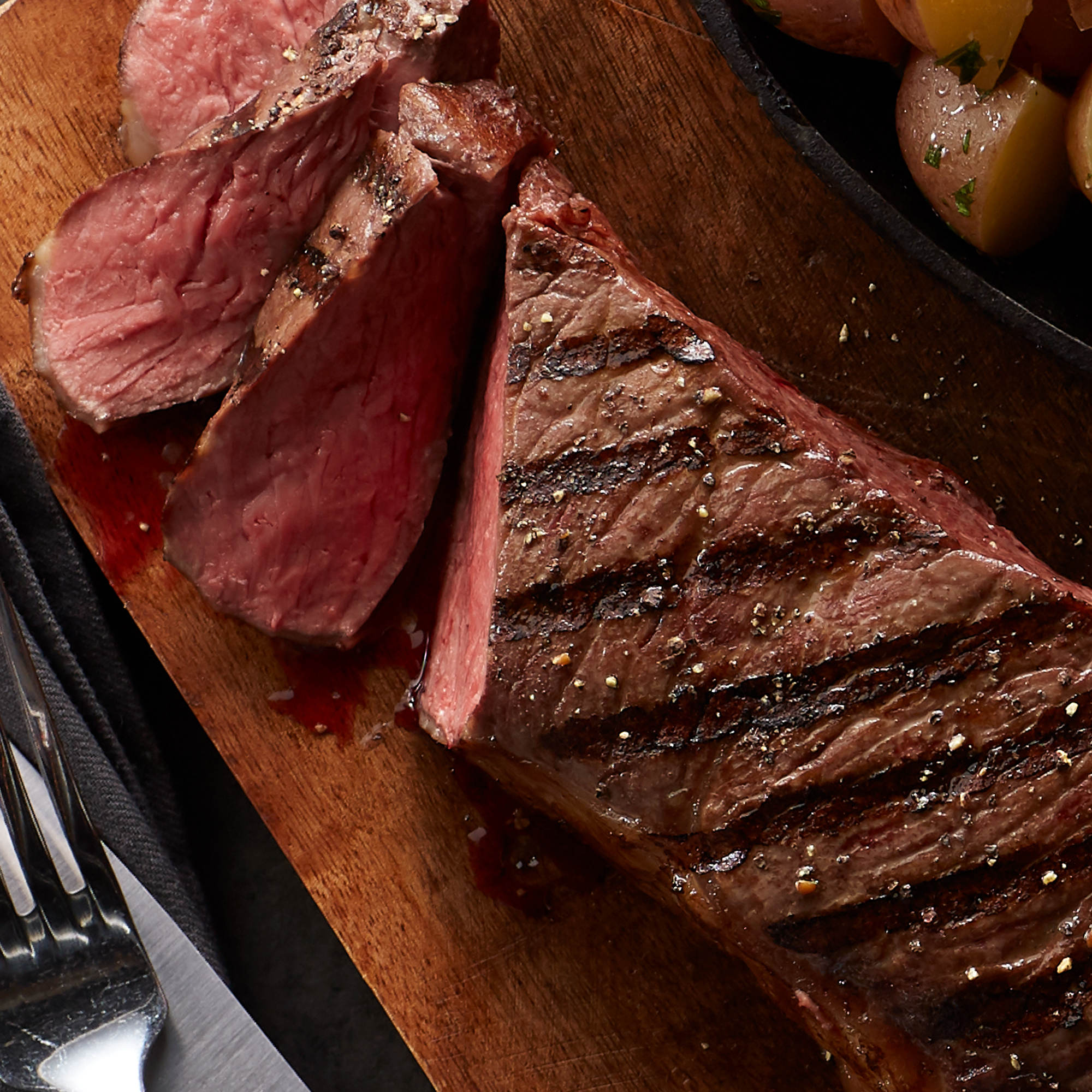 - Стриплойн-стейк — вырезка, которая выглядит скорее как филейная полоса, нежели как стейк.