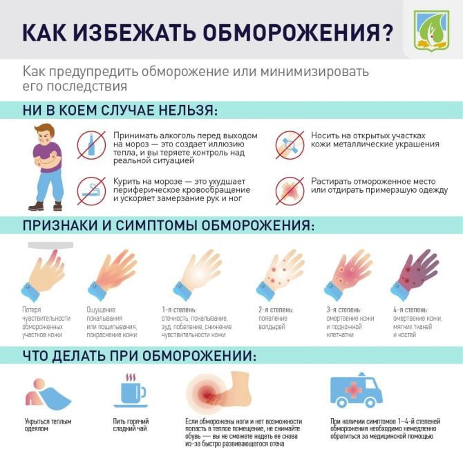 — Выходить на улицу строго в головном уборе, шарфом прикрывать нос для согревания вдыхаемого воздуха. Лучше надеть варежки, а не перчатки.
