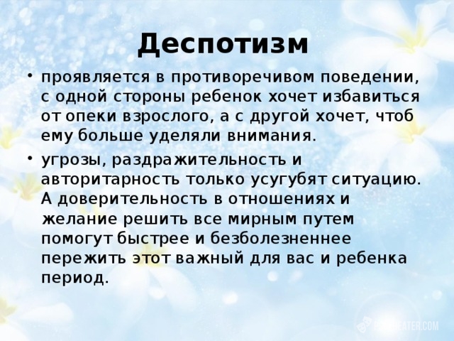 Деспотизм свойственен также пожилым людям и даже детям (первые проявления подобных тенденций возможны в возрасте трех лет и провоцируются наступлением кризисного периода).