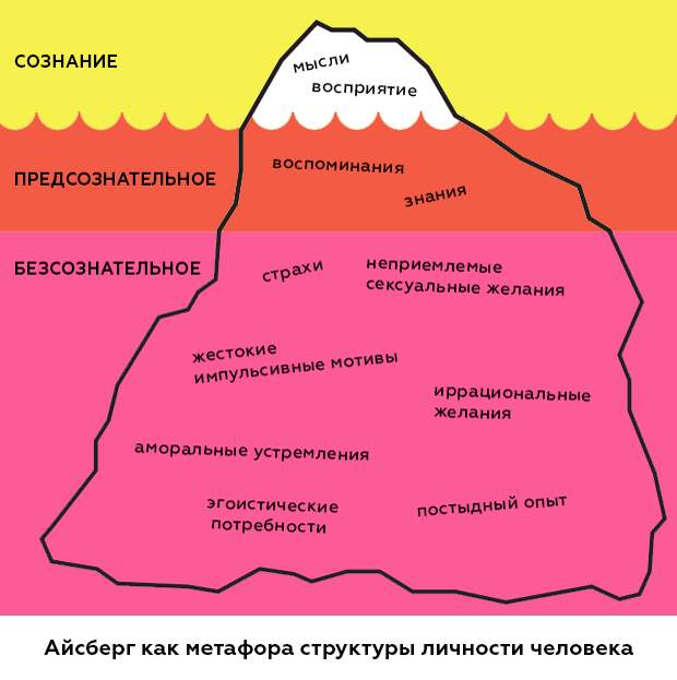 Дифференцировать бессознательное и подсознание сложно. что в обиходе они используются взаимозаменяемо — и многими профессиональными писателями также.Как и при различении того, что вытеснено, от подавленного, полезно думать о сознательном осознании как о верхушке айсберга: оно над водой , так полностью видимы. Бессознательное и подсознание, взятые вместе, гораздо больше, чем то, что может видеть глаз, оба существуют ниже того, что легко заметно.