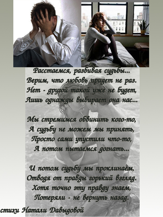 И влюбилась в другого. Страшно влюбилась. Взаимно. Но у него тоже жена, дети. И я решила, что не хочу бить две семьи. Рассталась. И схожу с ума, как это пережить. Кажется, такого человека не встречала никогда и не встречу.