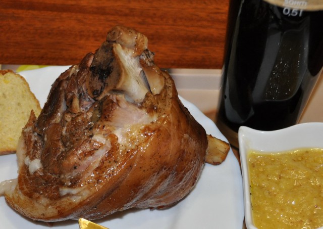 Подавайте домашнюю свиную рульку на толстой деревянной доске, украсив веточками зелени. Отдельно в соуснике подайте соус из горчицы и меда. Завершающим штрихом в этой композиции станет бокал темного пива.