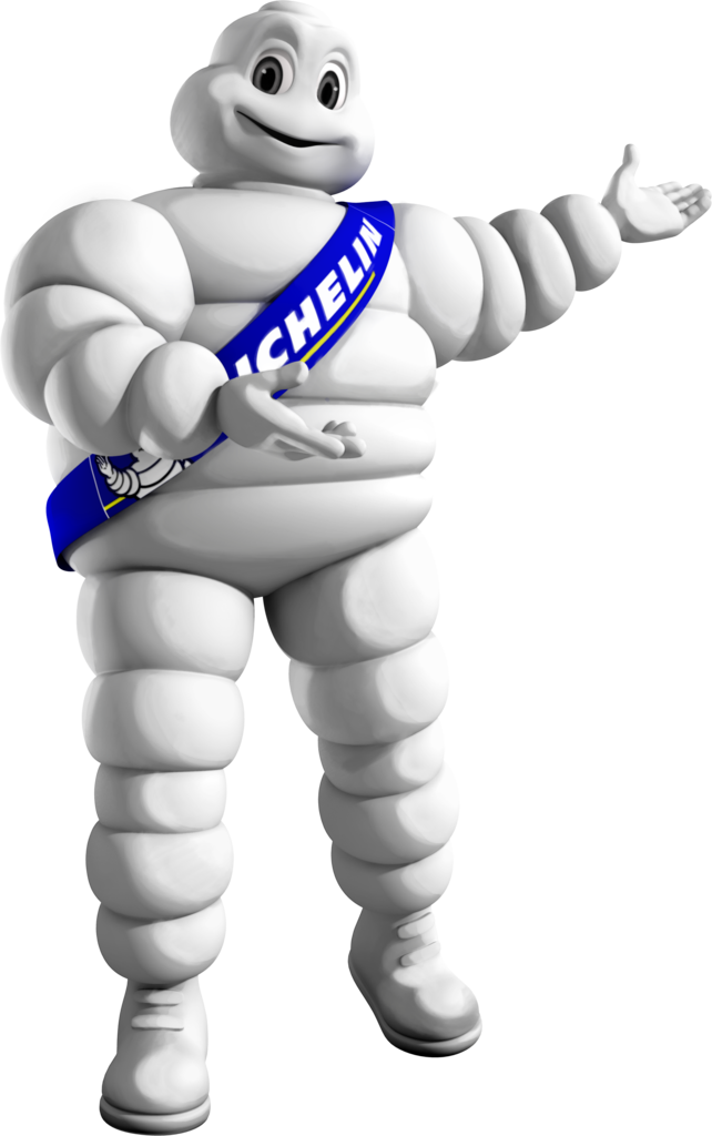 На нем изображено название бренда Michelin, большое и жирное, выполненное заглавными синими, черными и белыми буквами, а также талисман торговой марки Bibendum, который был создан в качестве логотипа Michelin в 189 году.8.
