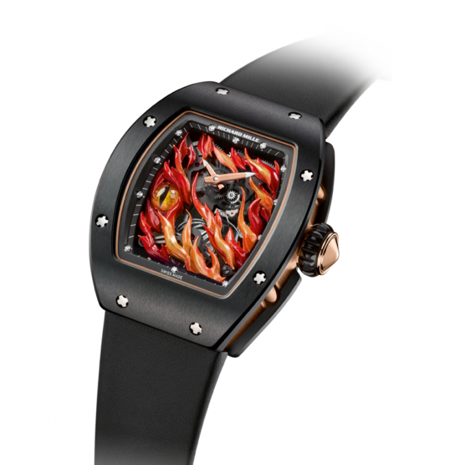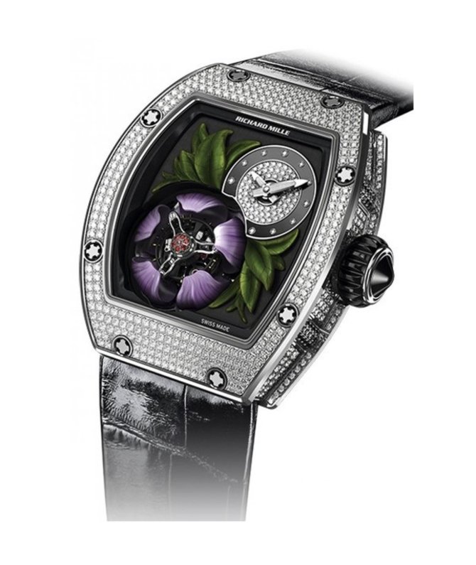 Еще через год на свет появятся первые женские часы марки, снабженные двухсторонним подзаводом. Оснащенную изящной заводной головкой в виде конуса модель RM 007 украсит россыпь драгоценных камней, инкрустированных в циферблат, а также по периметру корпуса.