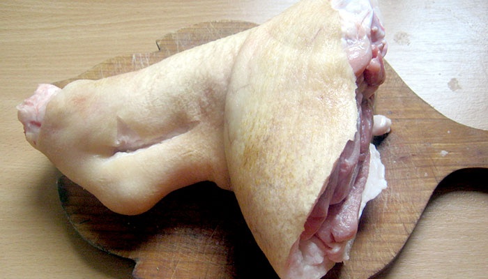 Если мясо свежее, при надавливании пальцем образуется неглубокая ямка, которая быстро исчезает – это будет признаком упругости. Когда на месте вмятины выделяется розоватый сок, можно сделать вывод, что голень подвергалась заморозке, а потом была разморожена.