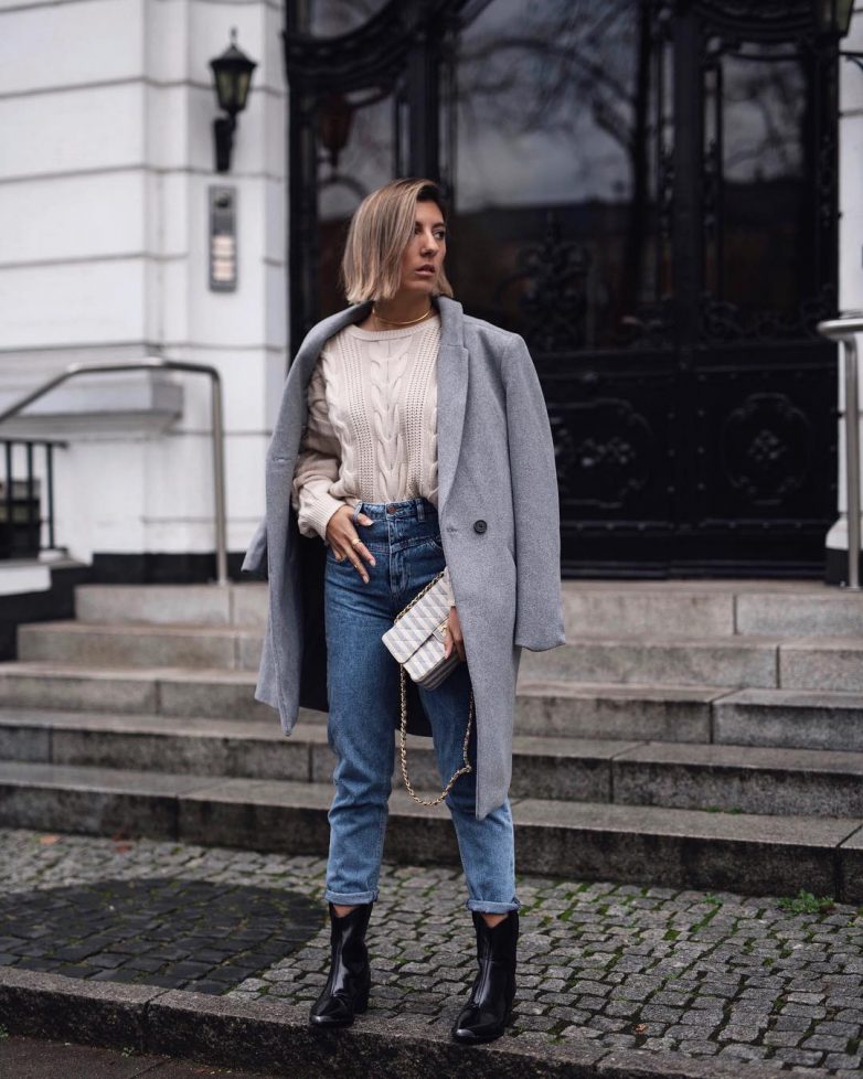 Светлый, цвета слоновой кости или светло-серый гольф, с темными бойфрендами можно надеть в тандеме с лодочками на каблуке и кашемировым пальто. На более позднюю осень вместо пальто, наденьте базовый тренч песочного цвета.