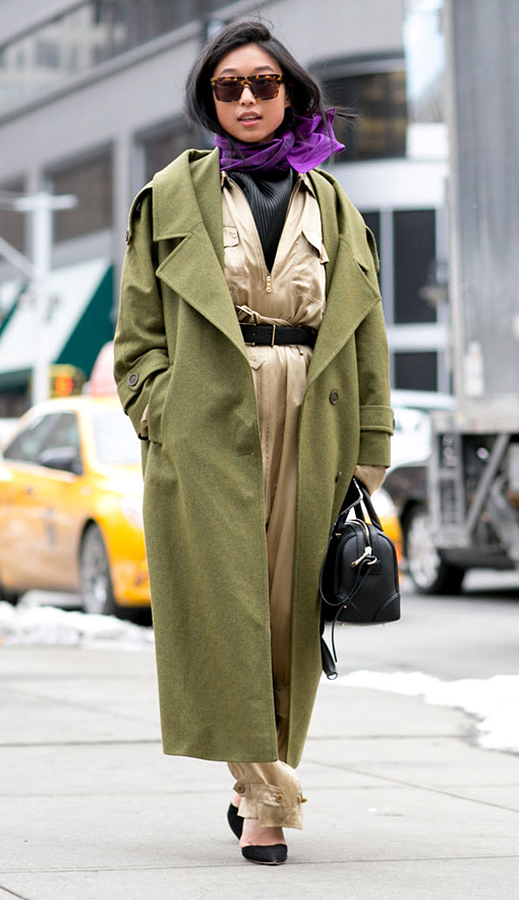 В моде яркие лаймовые и приглушенные малахитовые, бутылочные, болотные тренчи разной длины. К тому же, длина пальто варьируется в зависимости от времени года и погоды за окном.
