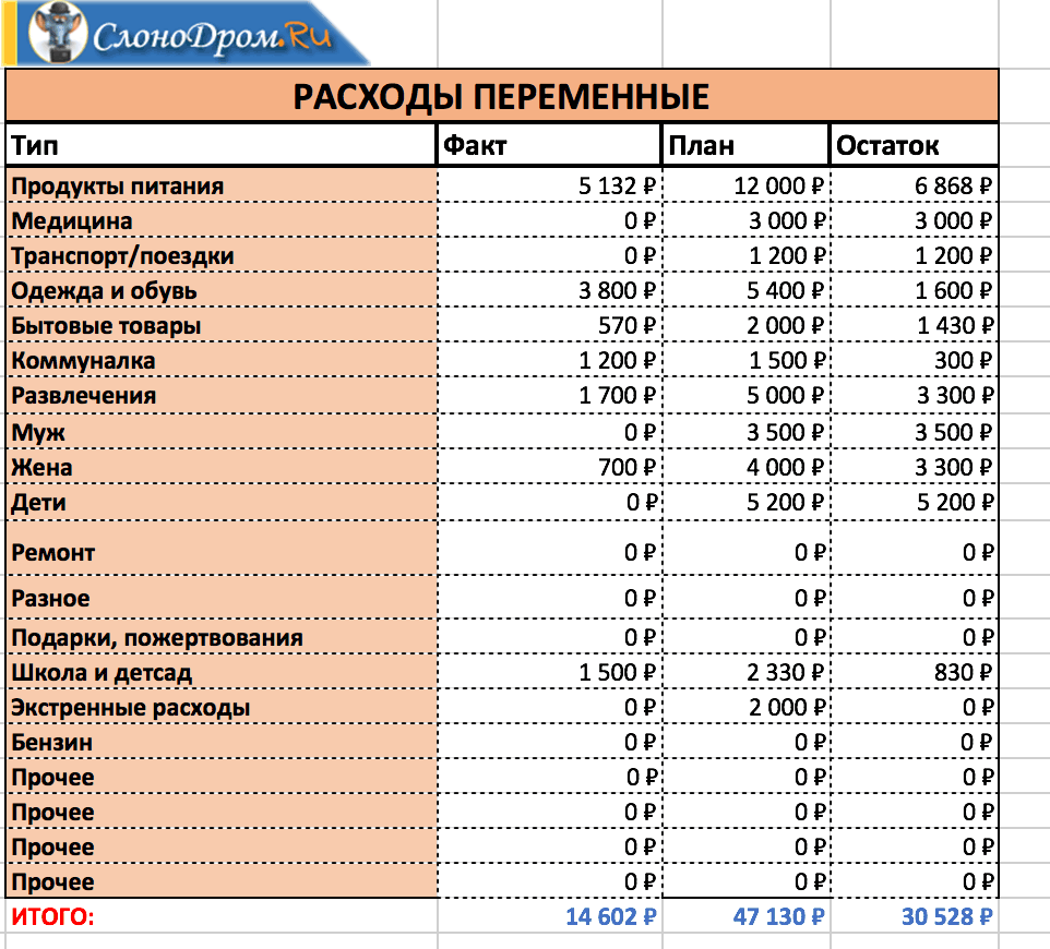 1. Первый месяц достаточно просто записывать все поступления и траты. Главная задача сейчас — узнать, сходится ли баланс, сколько остается свободных средств.