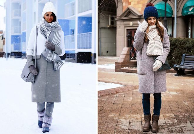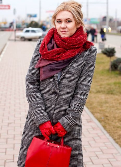 Тем не менее, при сильном ветре будет нелишним накинуть на голову красивый платок, который будет контрастировать с верхней одеждой. Так, если светло-серые варианты хорошо сочетаются с аксессуарами ярких и интенсивных оттенков, например, голубого, изумрудно-зеленого или малинового, то темно-серое пальто лучше смотрится с предметами нежных пастельных оттенков – розового, кремового, бледно-лилового и других.