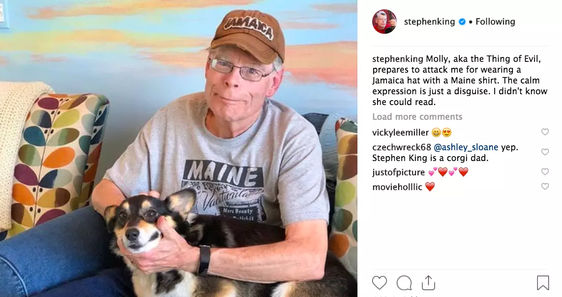 Теперь о важном деле. Мы здесь, чтобы сообщить, что корги Стивена Кинга, Молли, также известная как Существо Зла, не замышляет ничего хорошего, и мы все о ее царстве восхитительного ужаса.