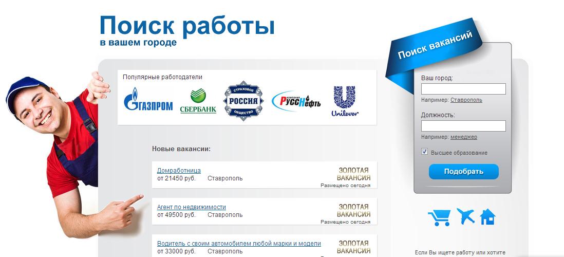 Сайт существует около 17 лет и регулярно публикует актуальные вакансии. Каталог должностей небольшой, в основном там «классические» профессии – бухгалтер, водитель, врач, юрист, кассир и т.д. В блоге сайта размещены полезные для соискателей статьи.