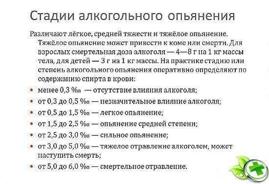 Смертельным опьянение становится при содержании алкоголя больше 5,0‰. Для взрослых лиц смертельная доза чистого этанола составляет 4-10 г/кг массы тела, а для детей — 3 г/кг.