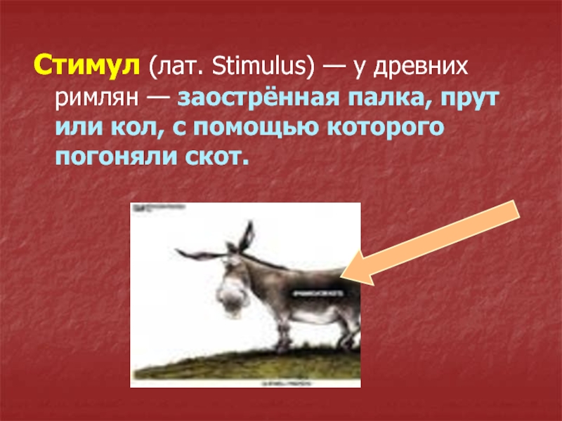 Стимул – это принуждающая причина. В латинском языке слово stimulus означает остроконечную палку, которой погоняли животных.