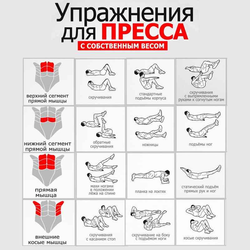 В эту группу входят не только мышцы живота, но и спины, бёдер, ягодичные и другие.