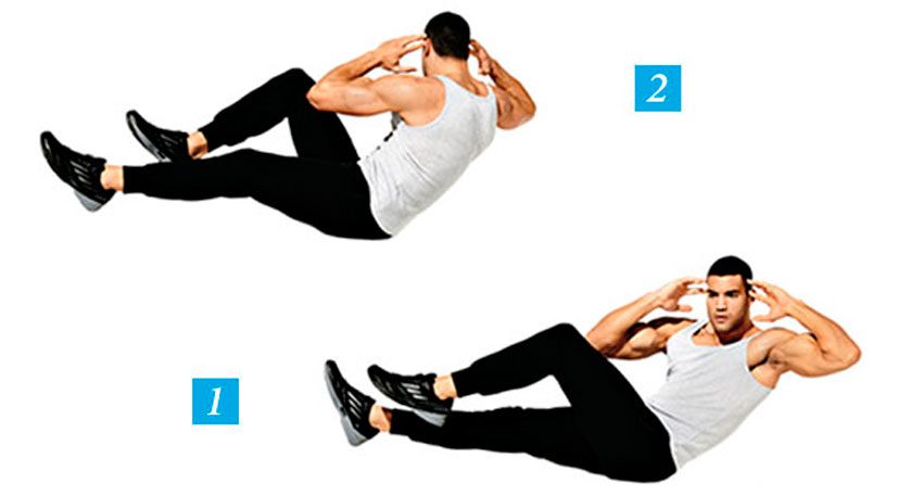 Это упражнение отлично подойдет для начального уровня. Исходное положение — лежа прямо на полу, ноги согнуты в коленях, ступни плотно прижаты к полу, руки в замке за головой. Чтобы немного упростить упражнение, можно зацепиться ступнями за устойчивую мебель, например, положить их под шкаф или низкий диван. Так нагрузка с мышц живота частично распределяется на ноги.