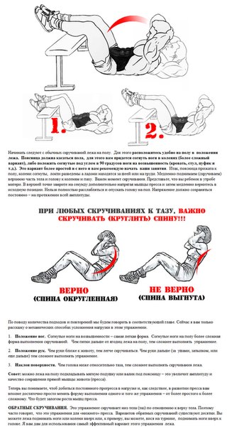 От классического жима на пресс, который все мы делали в школе, скручивание отличается тем, что от пола отрываются только лопатки и верхняя часть спины, а поясница и тазовая часть остаются плотно прижатыми к полу.