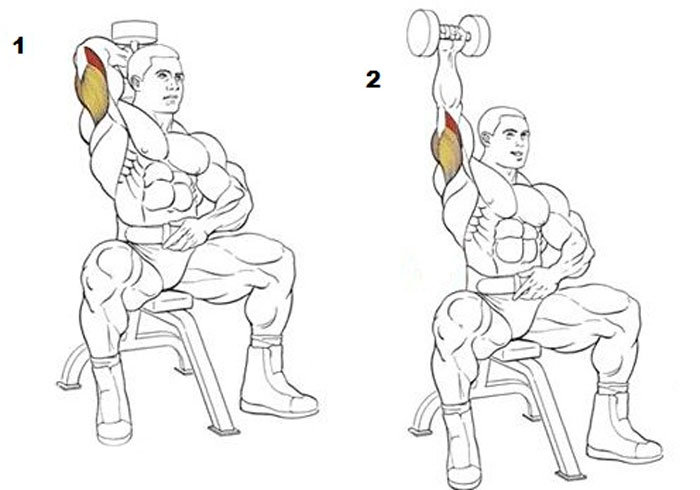 Возьмите гантель и поднимите ее над головой с выпрямленной рукой. Опускайте вес за затылок, сгибая верхнюю конечность в локте. После — с усилием выпрямляйте руку, акцентируя напряжение в трицепсе. Свободной ладонью придерживайте плечо работающей конечности.
