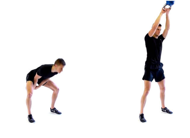 - Возьмите гирю, ноги расставьте шире плеч. Сделайте приседание и наклонитесь, сделав замах гирей. Затем резко выпрямите ноги и подайте вперёд бёдра, выжав снаряд наверх на уровне плеч.