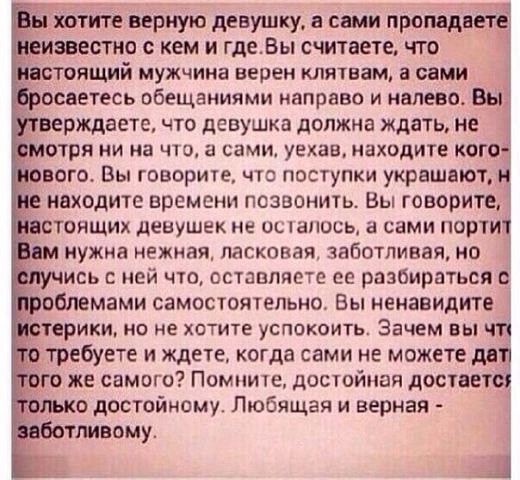 Ты пойми, каждой тваре по паре и получают они то, кем сами являются. Если у тебя даже верности (преданности) нет — то, мечтать о принце на белом коне — глупо. Этому не бывать никогда. Достойным мужчинам = нужны достойные женщины, а достойные женщины = в первую очередь верные женщины.