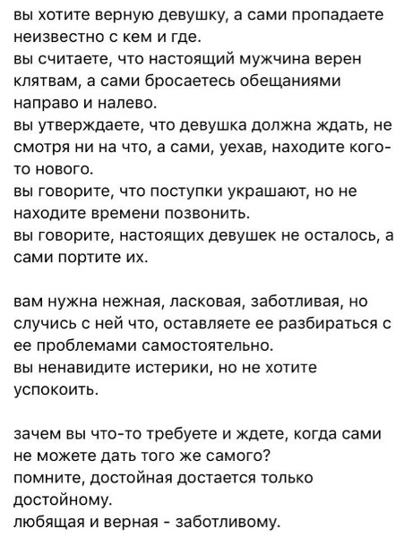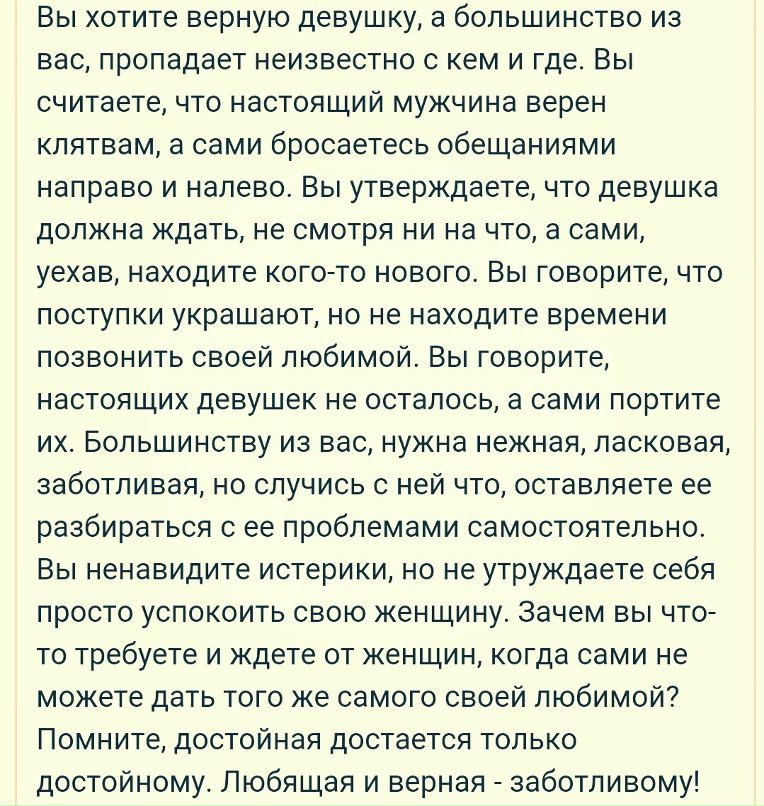 А рассказываю я это для того, чтобы мужчины во многом поняли = верность (преданность) женщины зависит не только от её моральных принципов, идеологии, воспитания, но и от того, что ты за мужчина.
