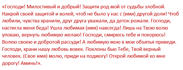 Дева Мария, прошу тебя: помоги мне, крещеной, прости все мои прегрешения жизненные. Услышь меня и исполни мою просьбу: верни в семью супруга моего, данного мне Богом, раба Божьего (имя супруга). Да будет так! Аминь!”