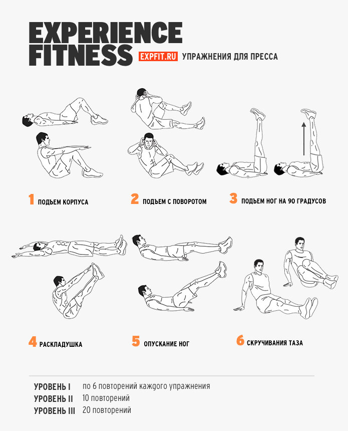 В начале занятий важно обратить внимание на правильную технику выполнения упражнений — это основа будущего роста и прогресса мышц. Начать стоит с базовых упражнений на верхний и нижний отделы прямой мышцы живота, а также на внешние и внутренние косые мышцы живота.Последнее упражнение комплекса предназначено для укрепления внутренних длинных мышц спины.