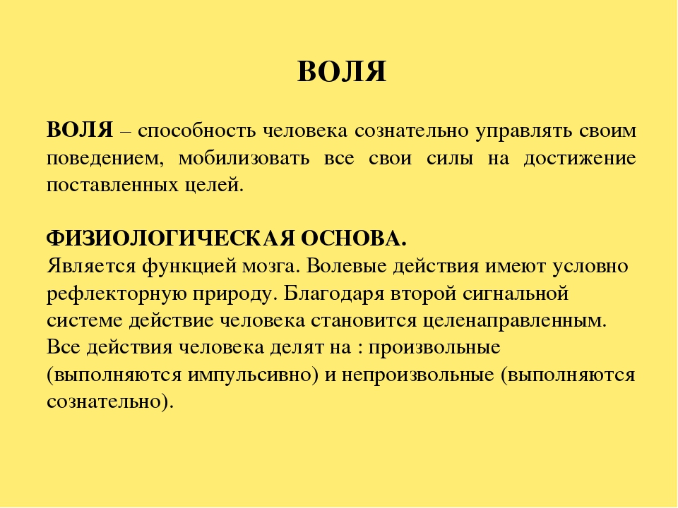 Воля – сознательная саморегуляция поведения, преднамеренная мобилизация поведенческой активности для достижения целей, осознаваемых субъектом как необходимость и возможность. Воля – способность человека к самодетерминации и саморегуляции. Воля – социально опосредованный механизм регуляции человеческого поведения: побуждение к волевым действиям совершается на основе социально сформированных понятий и представлений. Волевое действие ориентировано на будущее, эмансипировано, в отличие от эмоций, от текущей ситуации. Как писал И. М. Сеченов, человек мало-помалу эмансипируется в своих действиях от непосредственных влияний материальной среды; в основу действия кладутся уже не одни чувственные побуждения, но мысль и моральное чувство; само действие получает через это определенный смысл и становится поступком.