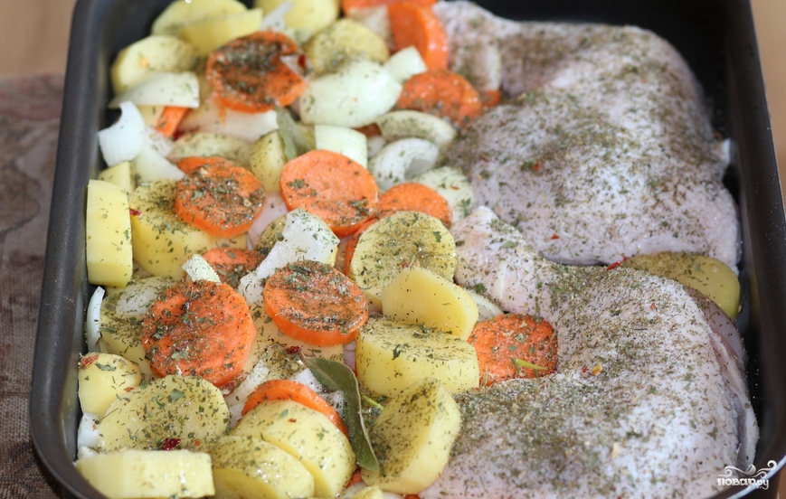 Теперь выкладываем на противень картофель и подготовленные овощи.