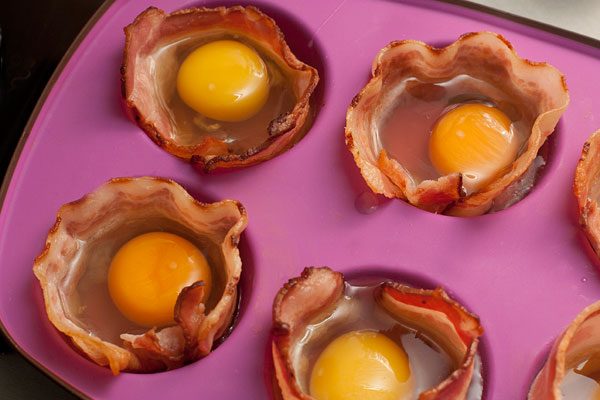 Формочки для маффинов выстланы ветчиной, создавая пикантные съедобные сосуды для запекания яиц внутри.