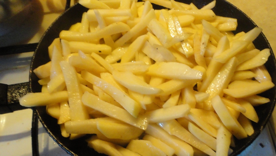 - Картофель чистим, нарезаем соломкой и вымачиваем не менее 30 минут в холодной воде;
